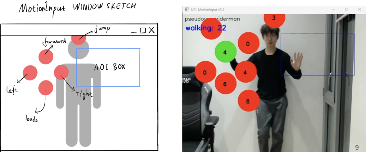 The Legacy MotionInput window UIs were modified from templates built by last year students. It was supposed to look like a game pad with trigger buttons (red dots) where the user can ‘touch’ the buttons via their wrist to trigger a control in game, such as walking around.