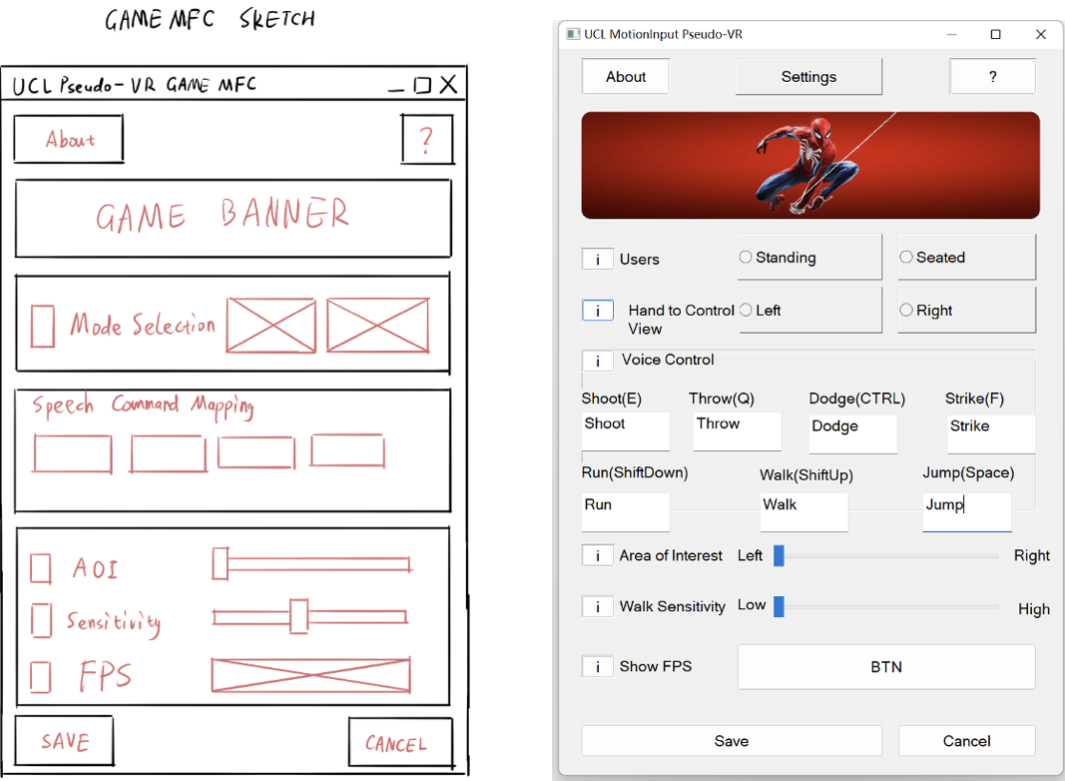 The legacy Gaming MFC is also modified from the previous build students had made last year. It includes features to modify settings in MotionInput, such as, standing and sitting mode or using left or right-handed mode to control the mouse.