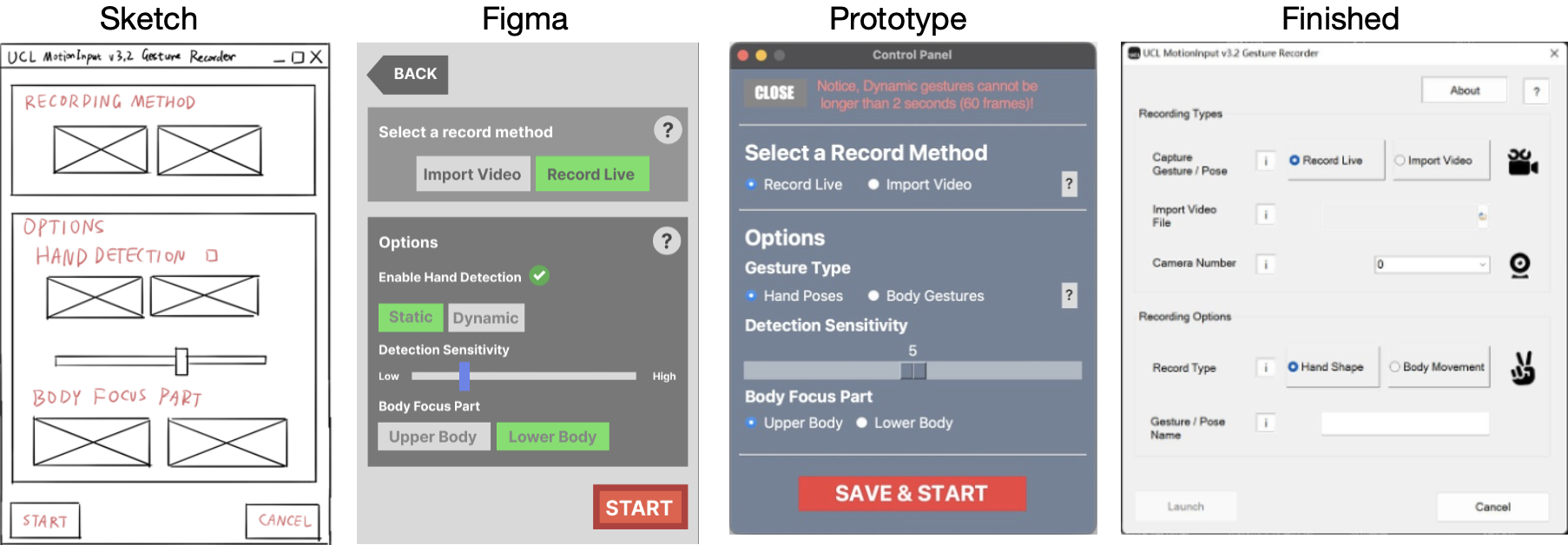 The Gesture recorder enables users to record a gesture or pose and store them as data files; its MFC includes features like, selection of different recording types (e.g., a hand pose or full-body gesture) and a naming slot. To make the UI more intuitive and user friendly, the buttons were made bigger and gif icons were added for most options. Also, the launch button is not available until the user selects everything needed. There is also an 'i' button to provide additional information for each option.