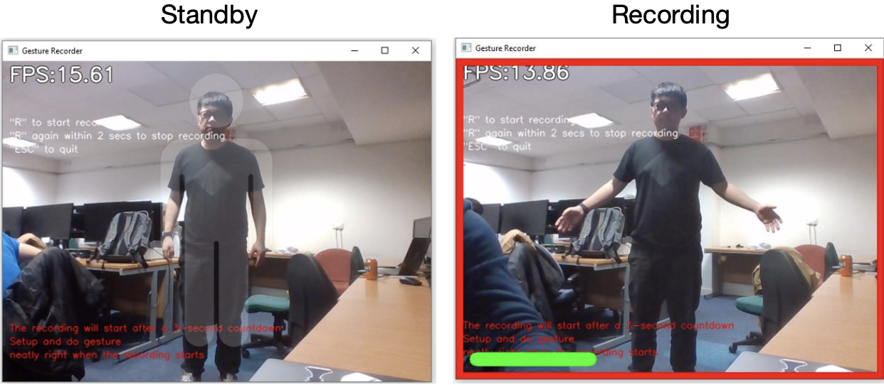 The Recording Window's design is supposed to be simple and intuitive. To continue with that logic, there is a guide frame for the user to be captured fully by the camera. Once the 'r' button is pressed; a 3 second countdown will occur, as indicated by the green bar, which decreases as the countdown progresses; along with a red frame, to indicate further that a recording is taking place.