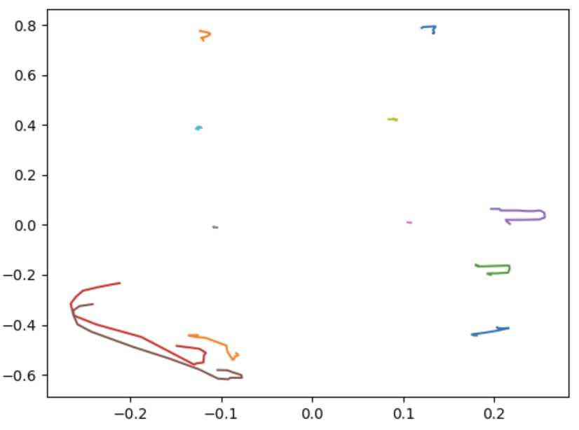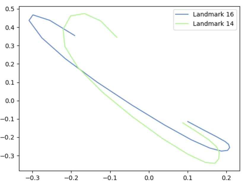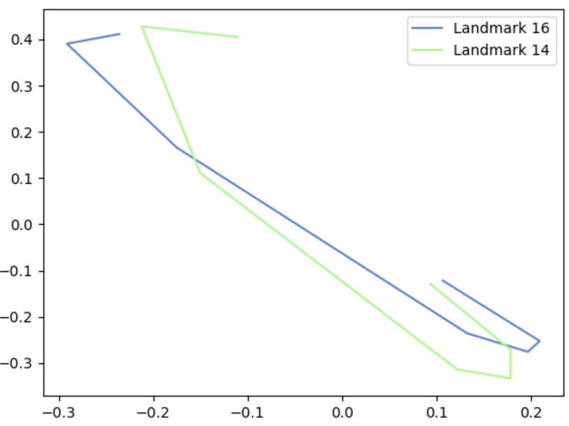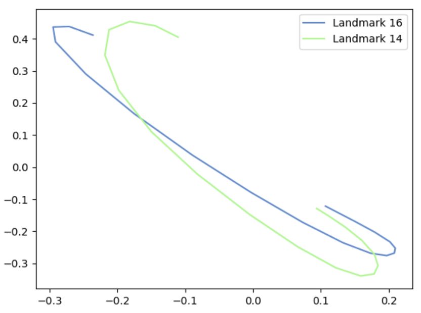 We construct the 2-by-\(n\) matrix, where \(n\) is the number of frames of the video. A matrix is made per landmark, representing the motion of it through space.