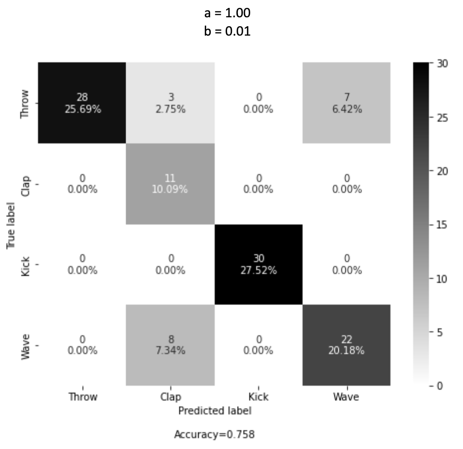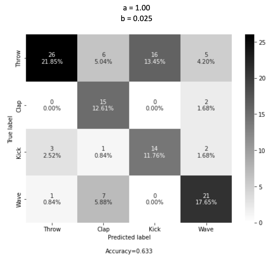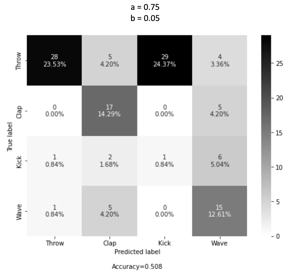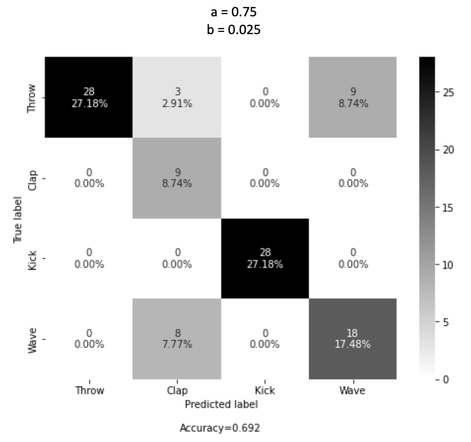From our results, we found an optimum accuracy of 75.8% with the values a = 1.00 and b = 0.01. Compared to the previous work done using a similar method which achieved a peak accuracy of 77.4% [2], we achieve a result within a similar range. However, our work can run in real-time, and the tests record the first gesture detected. Using a method where we combine pose detection and gesture detection to return the gesture with the lowest distance from the input, we can achieve an accuracy of over 89%: