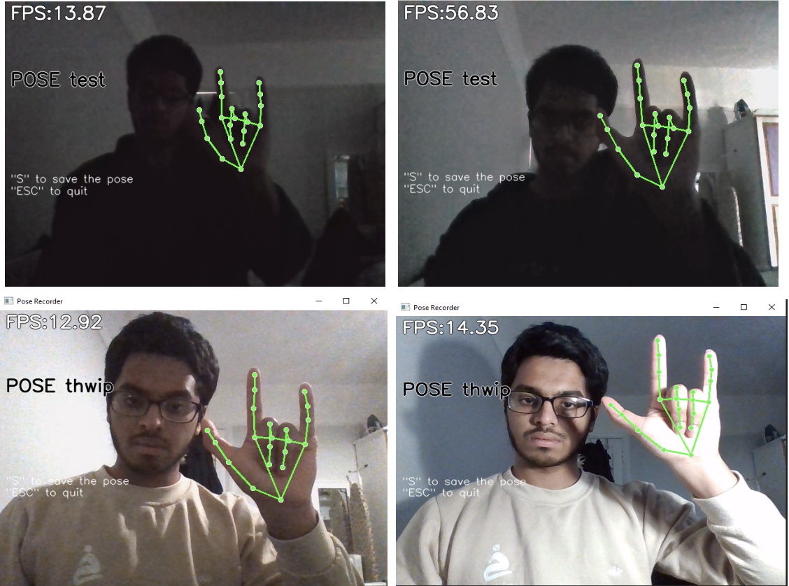 Method: Using the pose recorder as a visual reference, we measured the minimum and maximum distance from the camera to get a pose to work in different lighting conditions. This is a limitation of MediaPipe’s hand detection model, but we still wanted to see how that affected our project specifically. For testing we used the “thwip” gesture and was done only on PC 1 and PC 2. We had 3 different lighting conditions: very low light, medium light and very high light. Here are some examples of those lighting conditions: