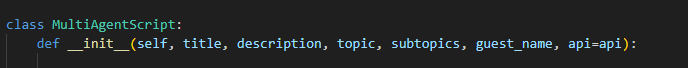 Firstly, there are two classes that user can choose from given the type of podcast that they want which is single or duo podcast. The classes are split into two different file in singleAgentScript.py and multiAgentScript.py. Lets have a look at singleAgentScript.py