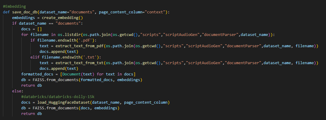 Initialising of huggingface embedding Main implementation of saving vector data from document directory Audio Generation