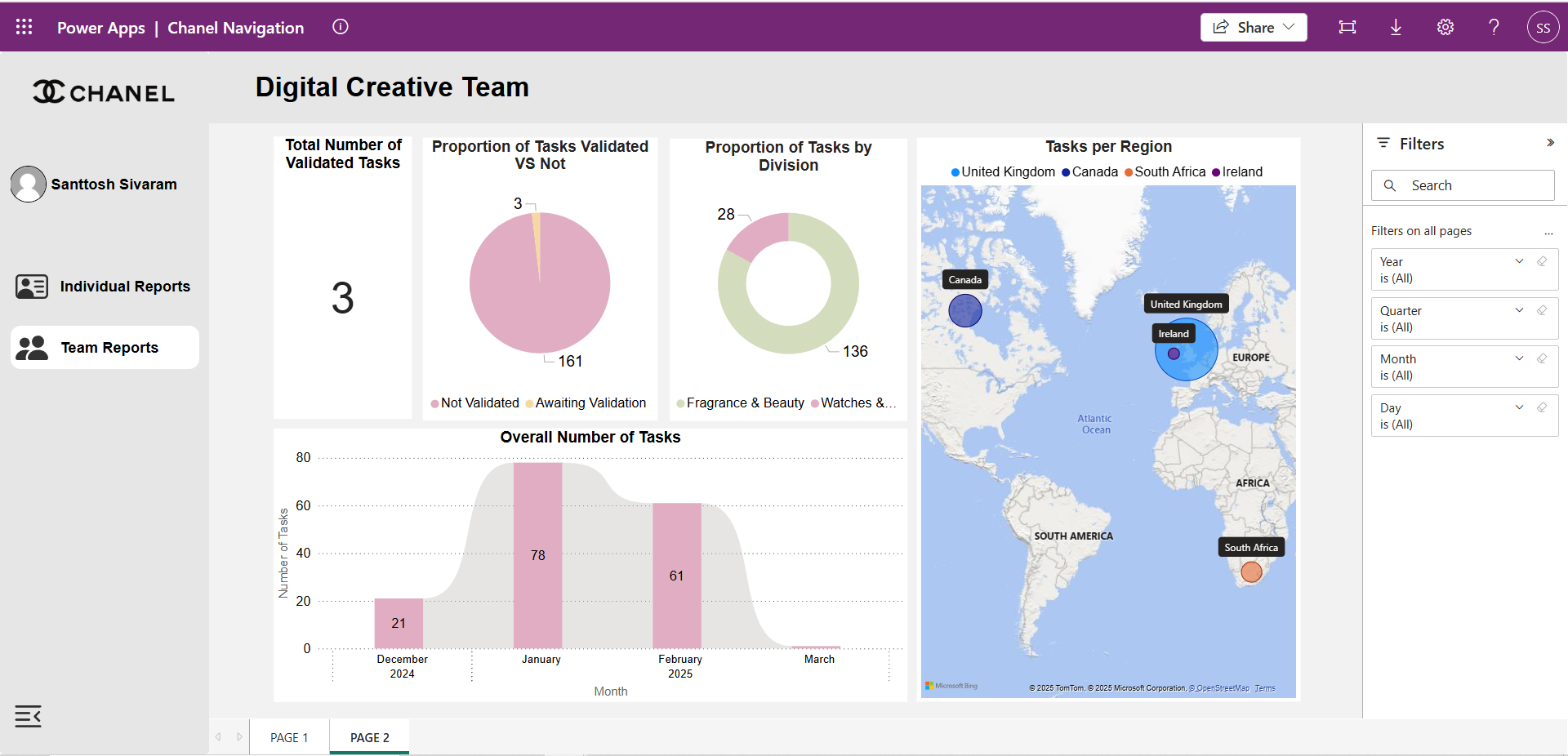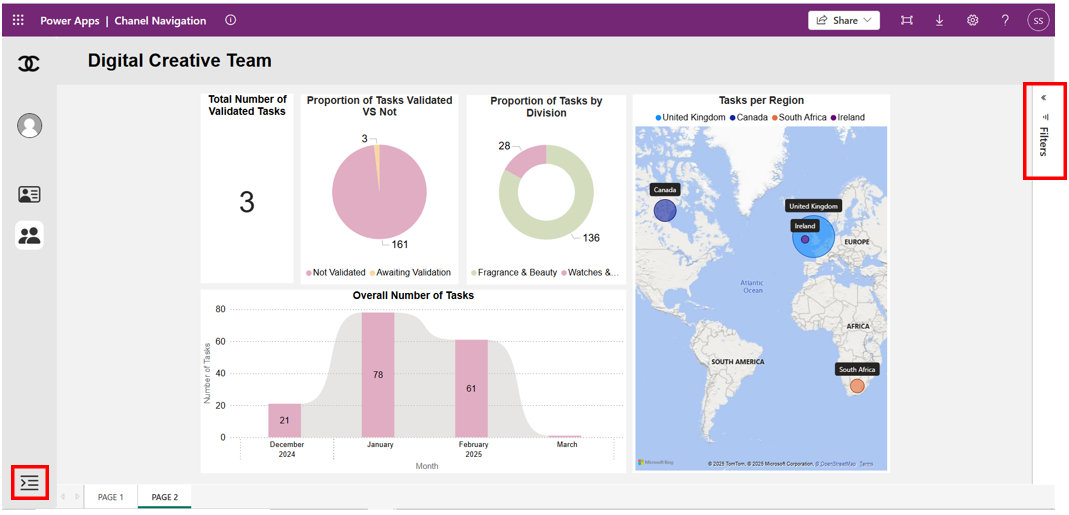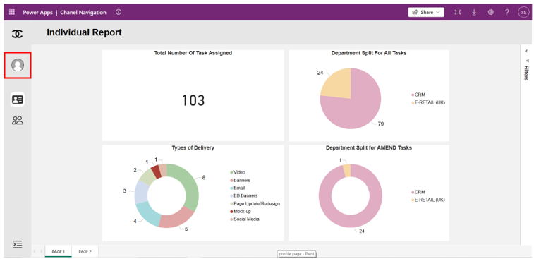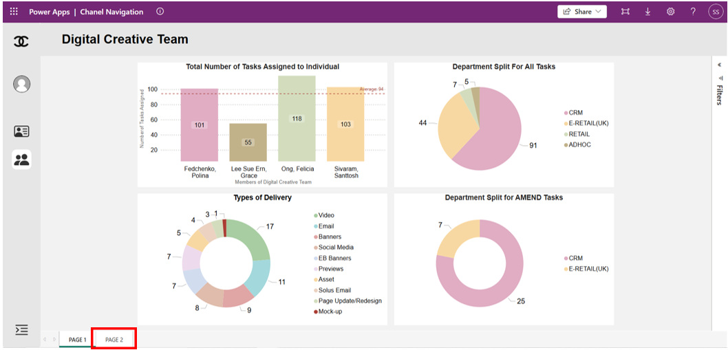 We have split our Power BI dashboard into two pages to reduce clutter and ensure a more organized display of charts and graphs.