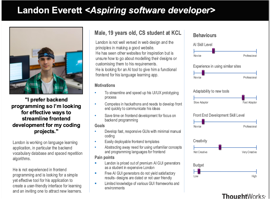 How We Collected Requirements We gathered requirements through: User interviews with developers, UI designers, and project managers. Market research on existing tools like Microsoft PowerApps, Wix and Visily. Feedback from industry professionals to understand development pain points. Technical feasibility studies on AI-driven layout generation. 3.2 Surveys and Analysis We designed a survey targeting: Developers who need rapid UI development. Project managers aiming for efficient team workflows. UI/UX designers looking for AI-assisted design suggestions. The survey included: Multiple-choice questions on preferred development tools. Ranking-based questions on UI generation needs. Open-ended questions for feature suggestions. Key Findings: The main reason why people use AI tools is to save time on repetitive tasks (66.7% of people identified speed as being extremely important in frontend development process) and generate design ideas. With most people already using AI tools to assist in programming. We found that improved accuracy, better customisation freedom and integration with popular frameworks and libraries were key requirements in an AI front-end development tool.