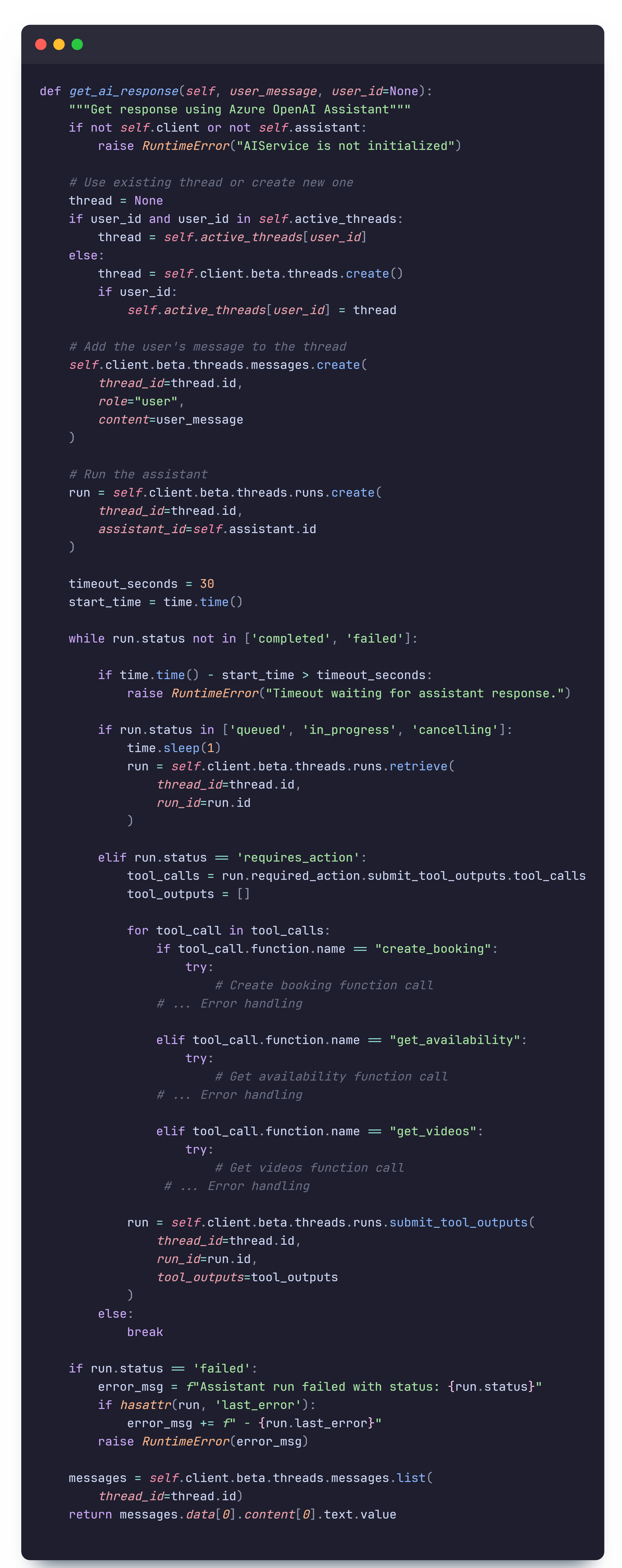 The AI assistant is developed using Azure OpenAI services. This approach was selected due to the robust integration capabilities Azure provides, along with access to the latest GPT models for generating high-quality responses. We used AI Assistants over chat completions as they provide tools for session management such as threads which allow us to retain context. They also have better support for function calling capabilities, which we use so that the AI can interact with our backend services and perform actions for users.