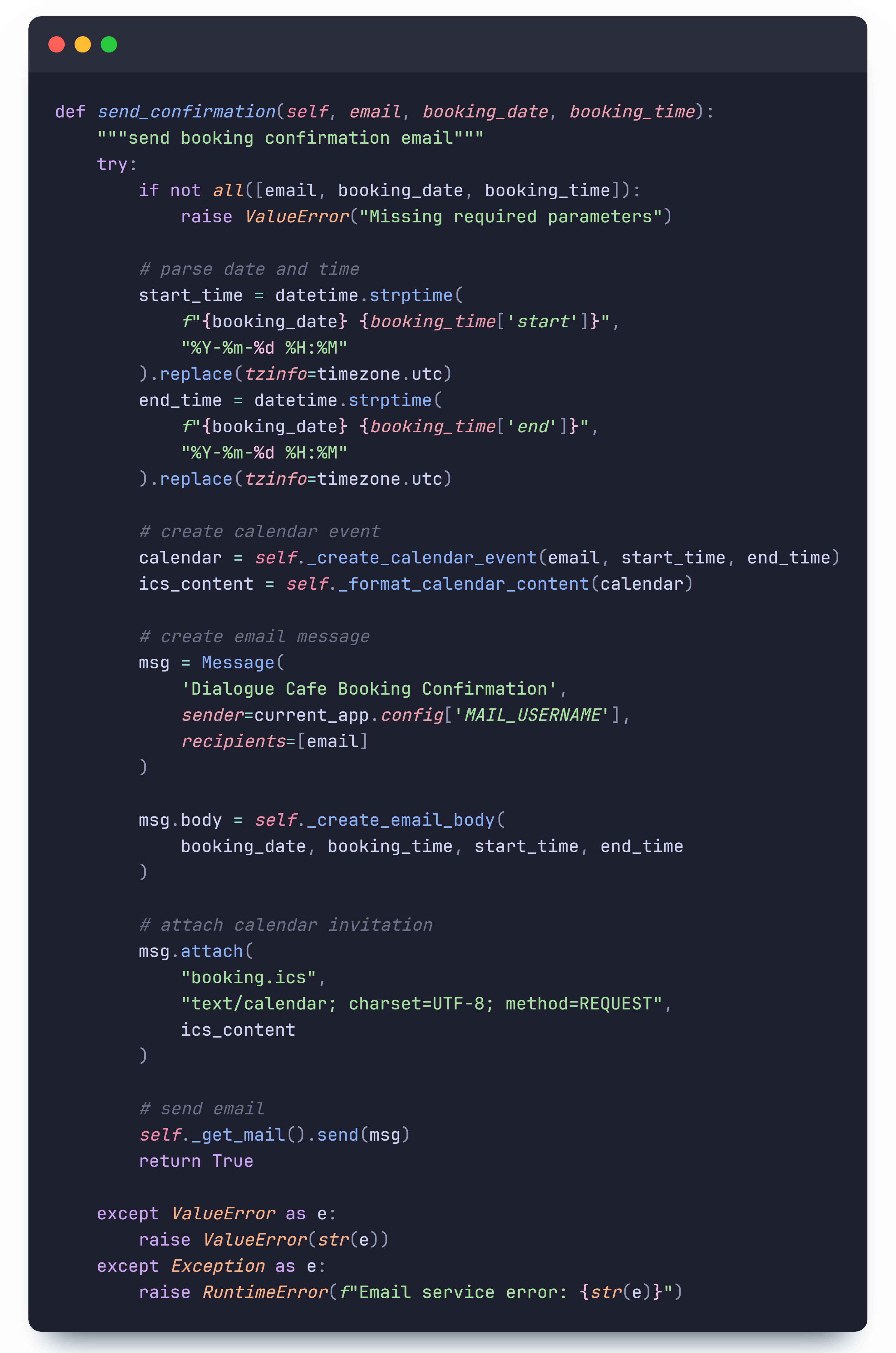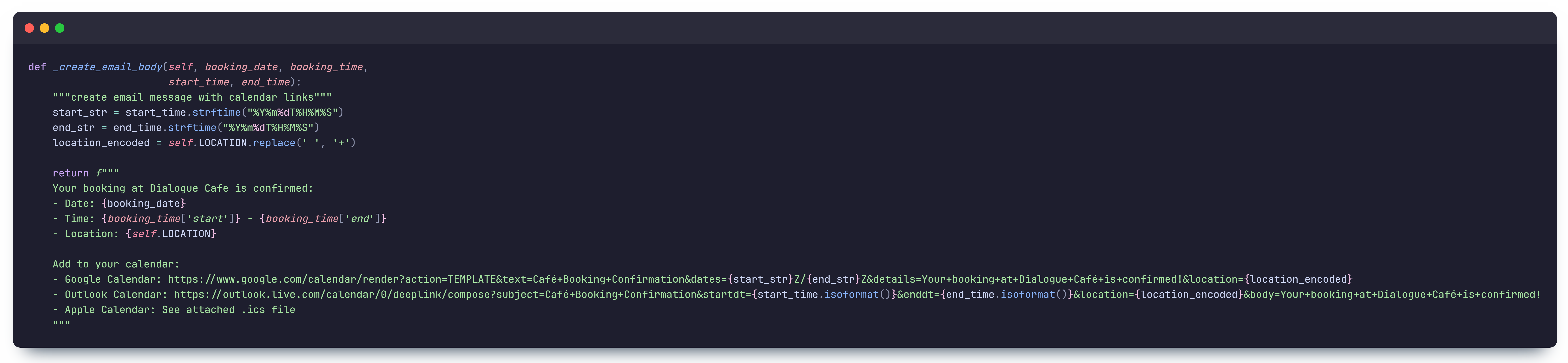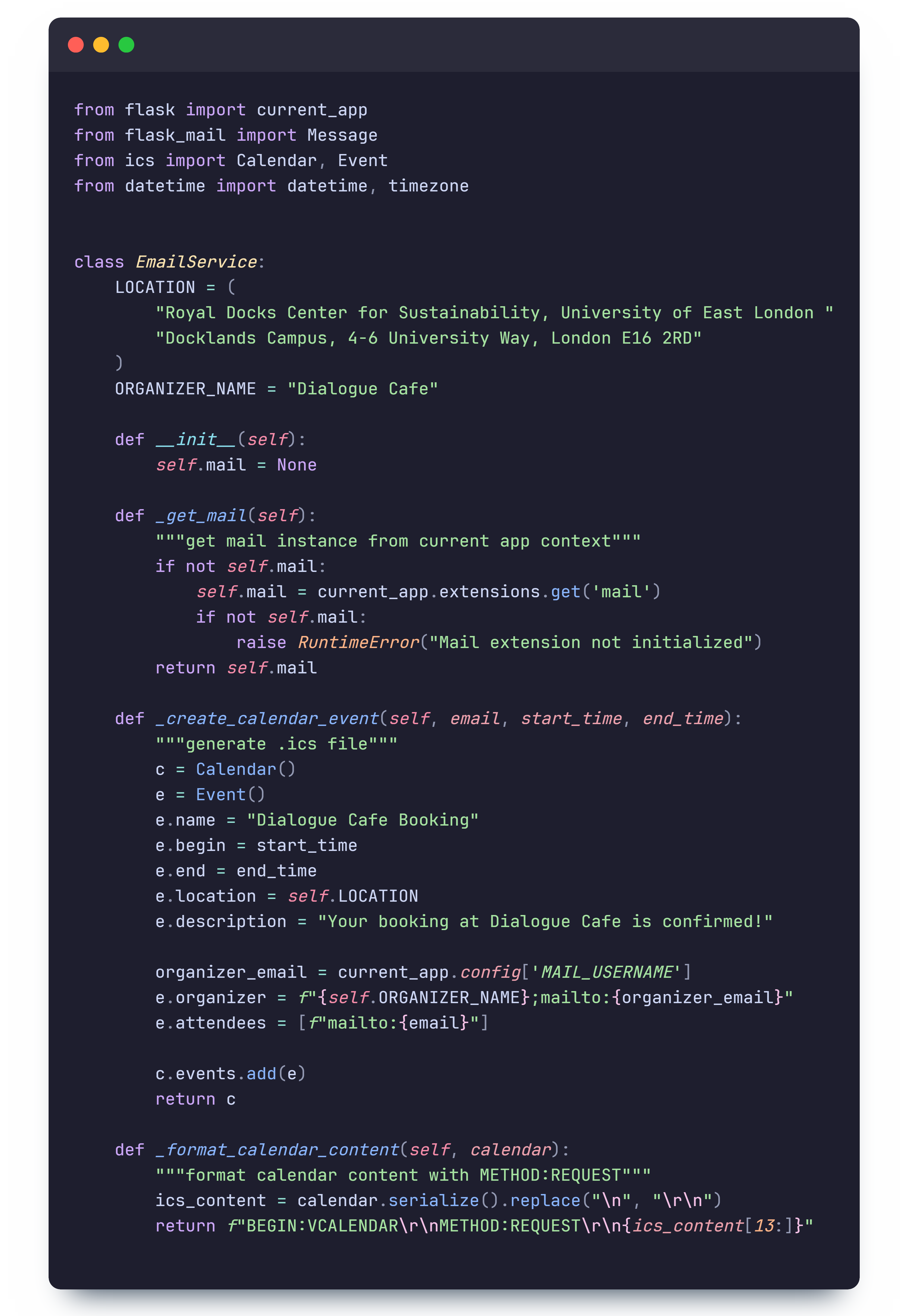 .icsfile using theicsPython package. - Constructing an email with the booking summary, calendar links, and an attachment.