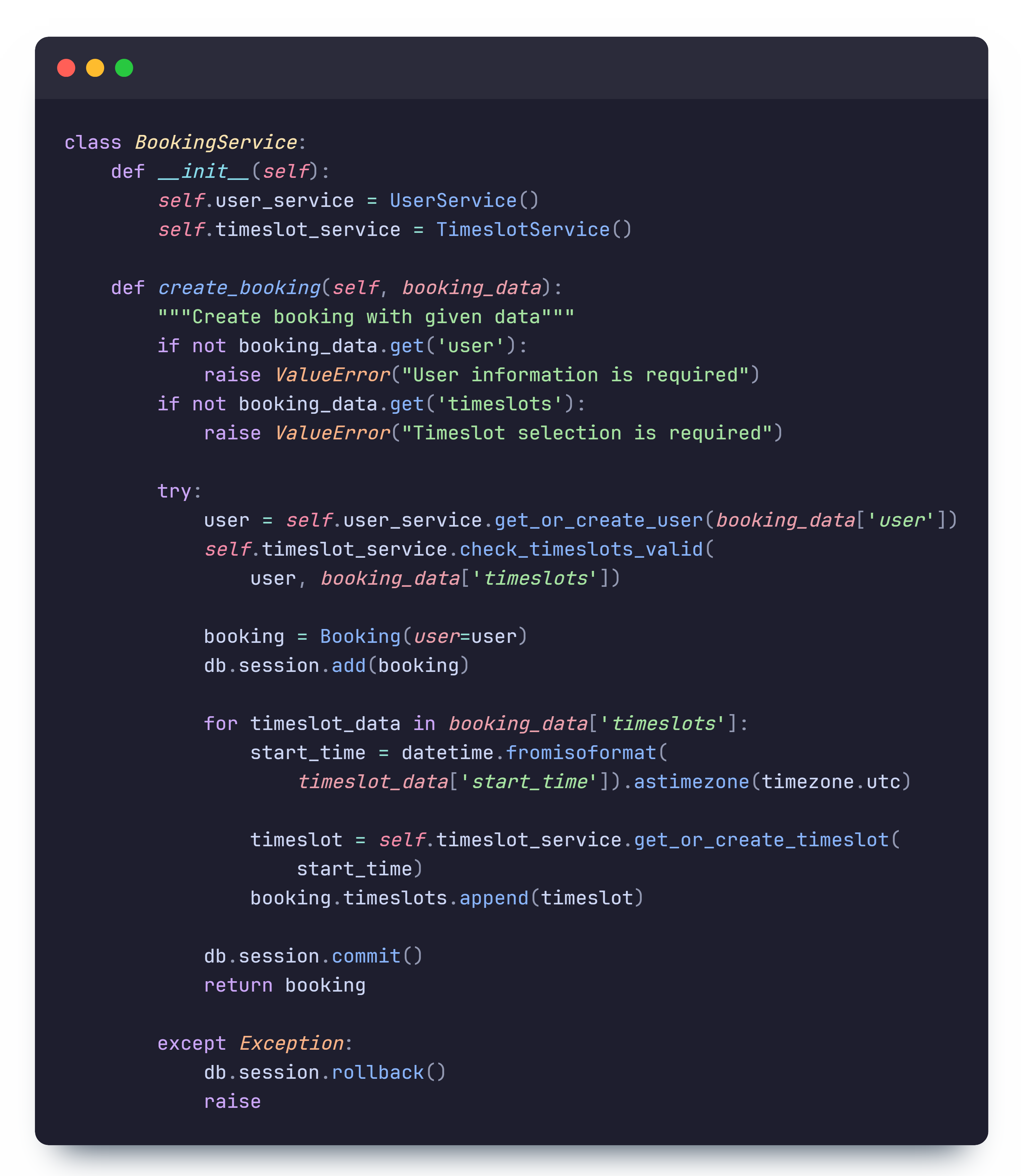 - SQLAlchemy: Database interaction layer for booking, user, and timeslot management