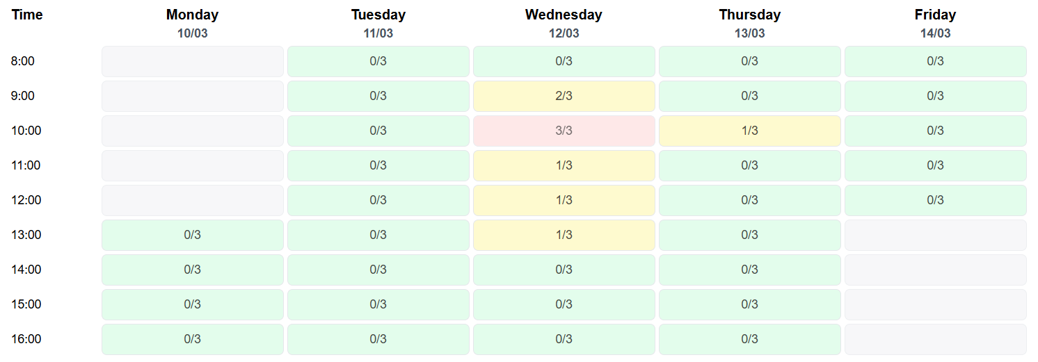 number of bookings for each time slot, e.g. green for high availability, yellow for medium availability,