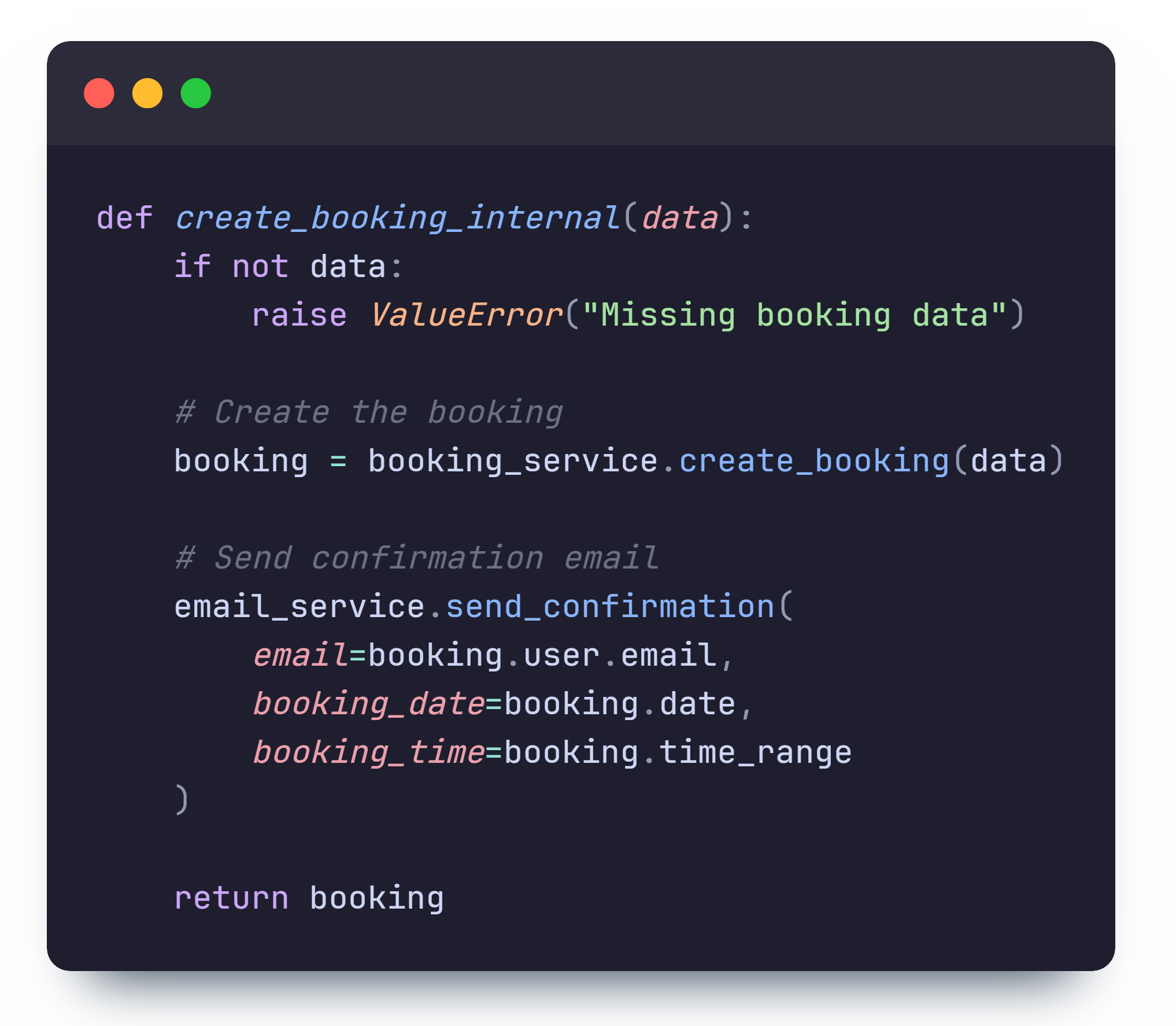 The route method itself contains a call to the internal method above and handles errors. The internal method receives user details and handles the booking creation process through the following steps: