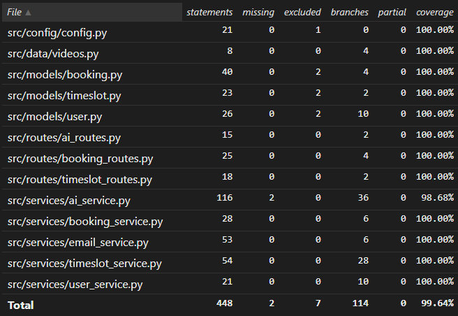 We used Coverage.py to measure our backend test coverage, achieving almost 100% coverage with 106 total tests. This comprehensive coverage ensures that our backend code is robust and functions correctly under all expected conditions.