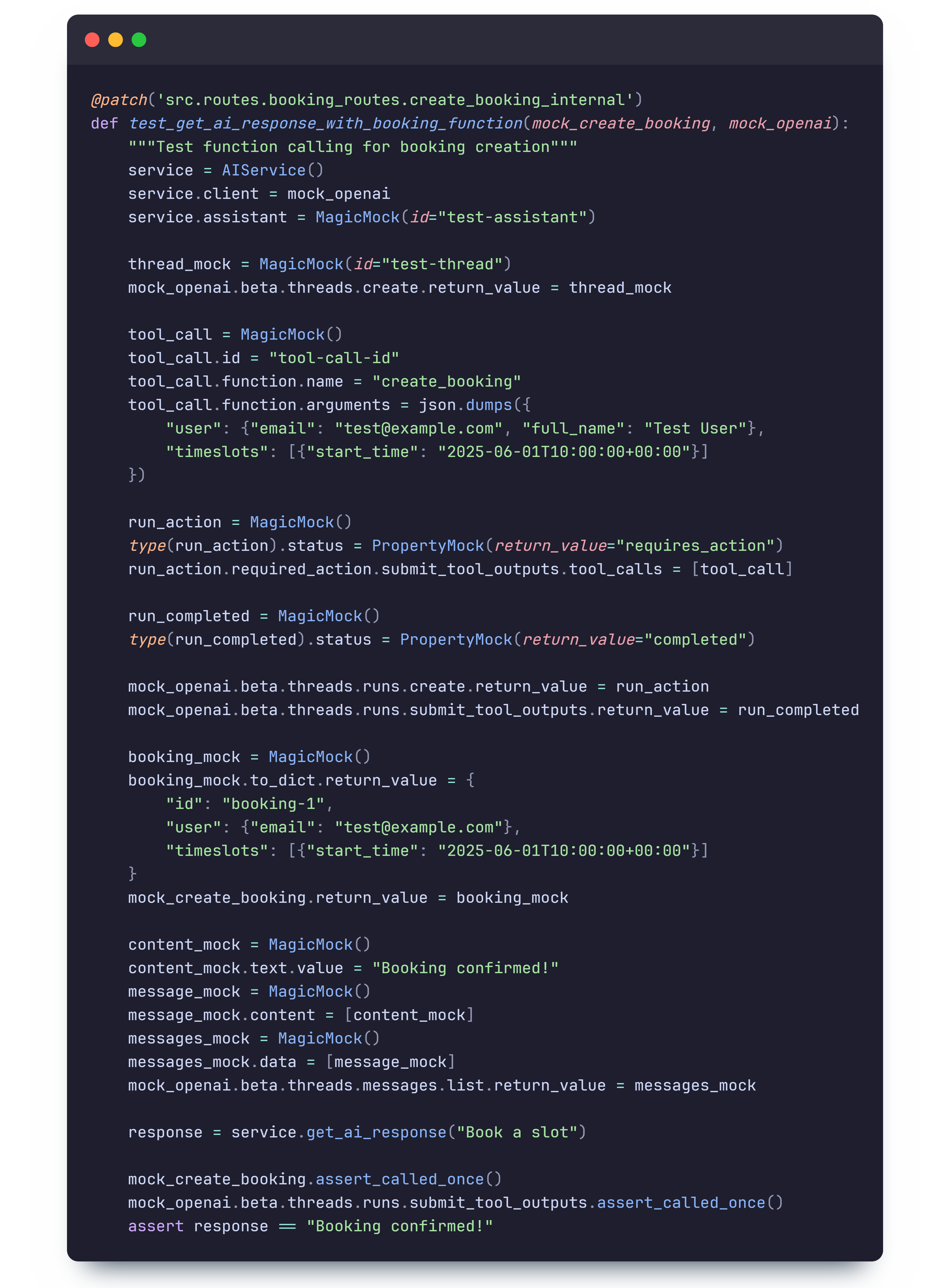 This test verifies that the AI assistant correctly processes a user's booking request and returns the expected response. By mocking the AI service, we can isolate this test and ensure that the AI assistant functions correctly.