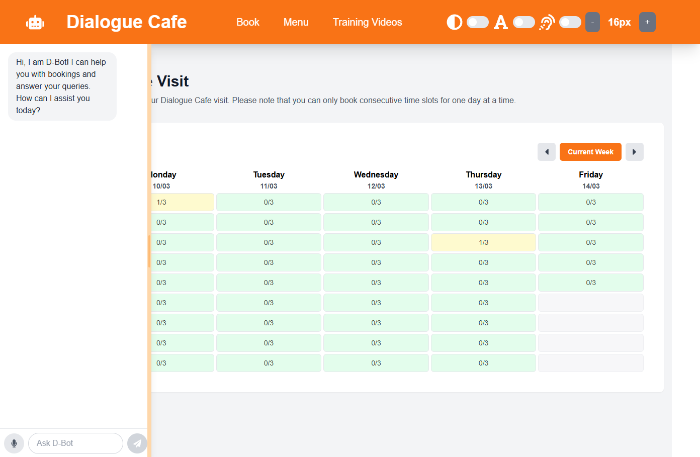 | AI Assistant Effectiveness | 4/5 | Elderly users found voice input particularly helpful, but input was occasionally misread. Most users were able to successfully book using the assistant, but at times the AI's responses were unclear or incorrect. Cafe staff found the assistant especially useful for answering common questions. University students found the assistant helpful but preferred the standard form interface for booking. Additionally, we had to explain some of the AI's capabilities to users for them to use it effectively so we may need to provide more information in the interface. |