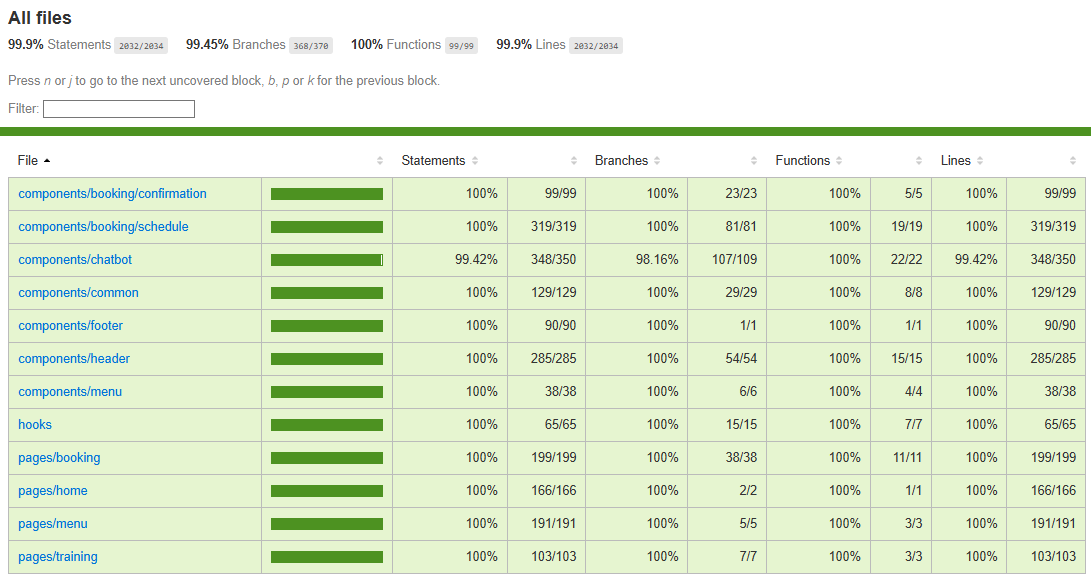 Using Vitest's native code coverage via V8, we achieved almost 100% test coverage with 182 frontend tests. This extensive testing ensures that all user-facing features work as intended without errors.