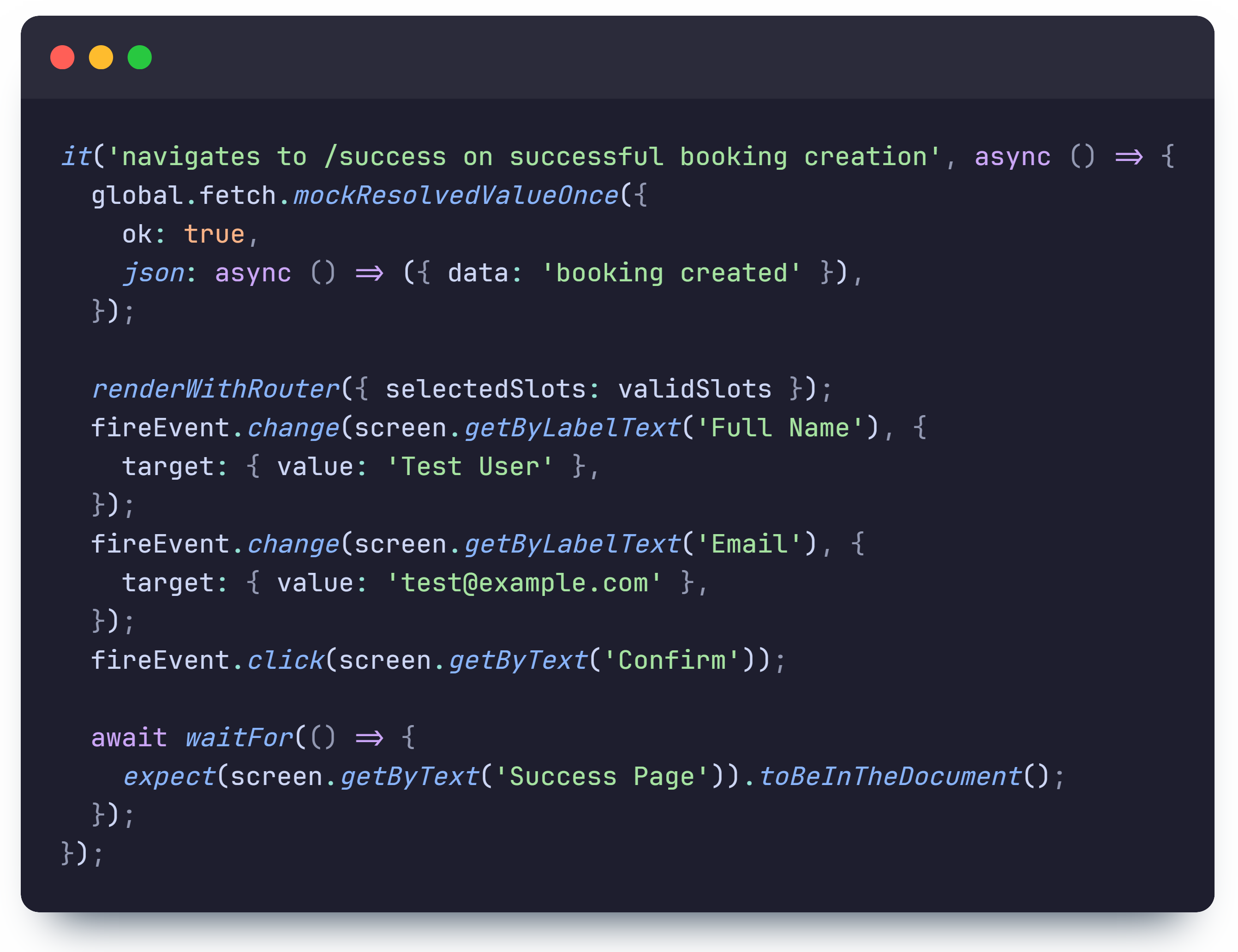 Example of a frontend test for navigation to success page upon successful booking: