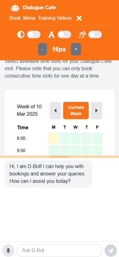 Users were asked to book a session using only the AI chatbot assistant rather than the standard form interface. Users with accessibility needs were encouraged to use voice input. This tested the conversational UI and whether it provided an effective alternative booking method.