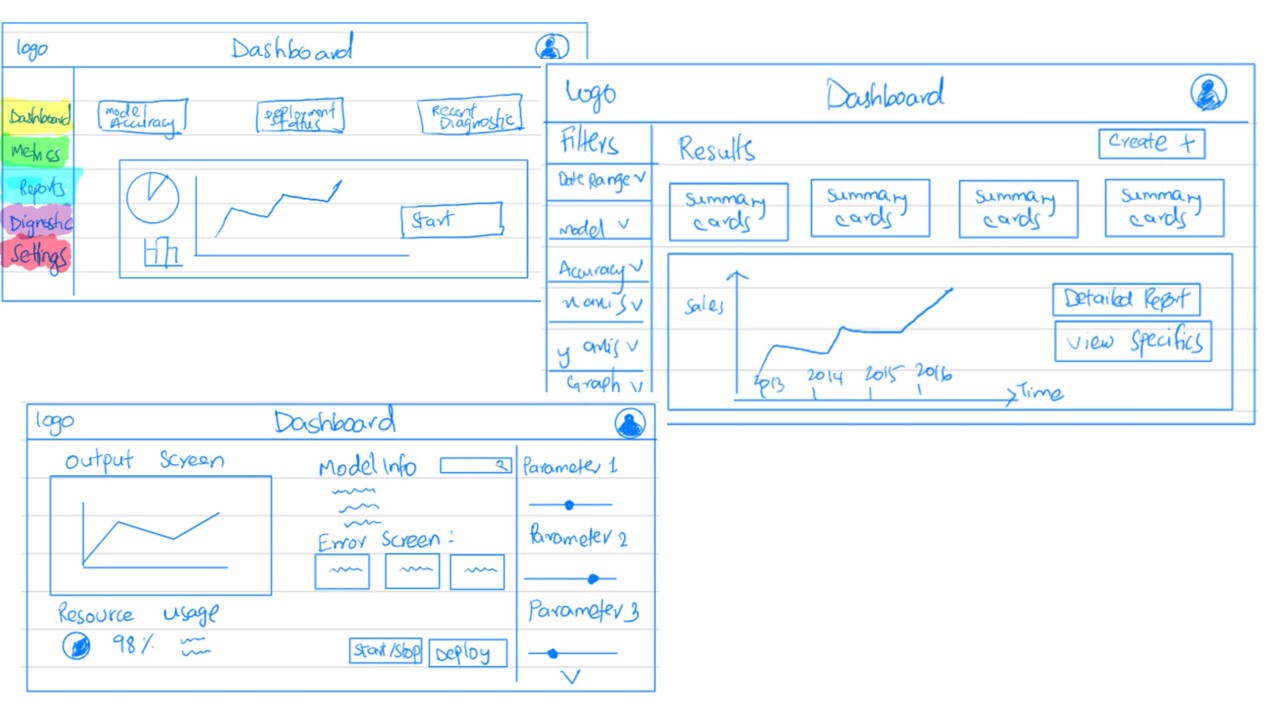 These design alternatives were sketched as a result of first iteration to explore different layouts and functionalities that cater to both business leaders and developers. Each view has unique features tailored to specific user needs, ensuring usability and adaptability for all stakeholders.