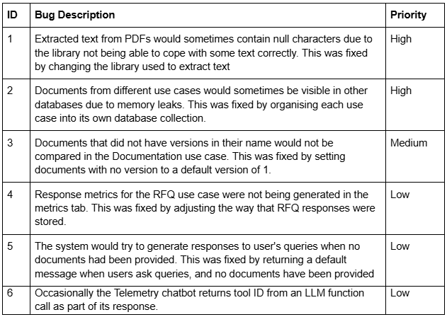 Reflecting on the development of our system’s user interface, we are happy with the outcome and its impact on usability. Using Gradio allowed us to create a clean, intuitive, and responsive interface that seamlessly supports multiple use cases. Rigorous testing ensured compatibility across devices, and interactive chat interfaces, drag-and-drop file uploads, and a structured metrics dashboard made the experience effortless and engaging. Also, the option to toggle between light and dark mode further enhanced accessibility. Most importantly, client feedback has been very positive, confirming that our approach successfully balanced functionality with ease of use. Overall, and we are confident our UI/UX decisions have resulted in a system that exceeds expectations.