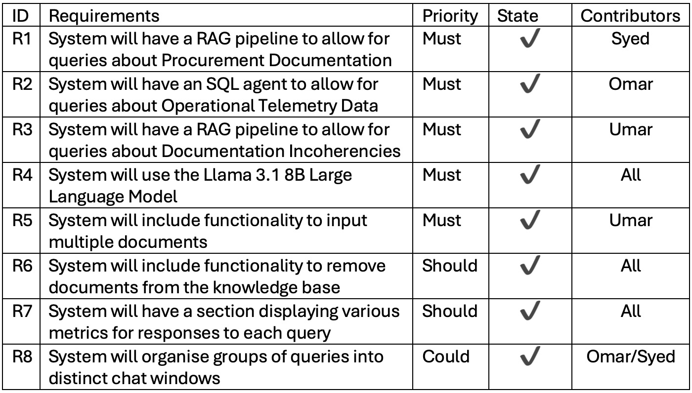 As the project progressed, the functionality of our system expanded beyond its original scope, evolving into a more comprehensive solution than initially envisioned. While the core objective remained providing insights for each use case, iterative development led to the integration of additional features that enhanced usability and efficiency. Early prototypes focused on fundamental retrieval and response generation, but through continuous refinement, we incorporated broader analytical capabilities, and improved document handling. This growth was driven by a combination of practical testing and feedback, ensuring the system became more robust and adaptable. The result is a highly functional tool that extends beyond its initial concept, offering a more versatile experience for users.