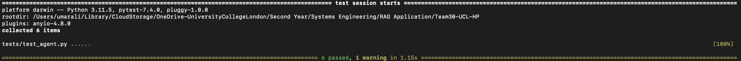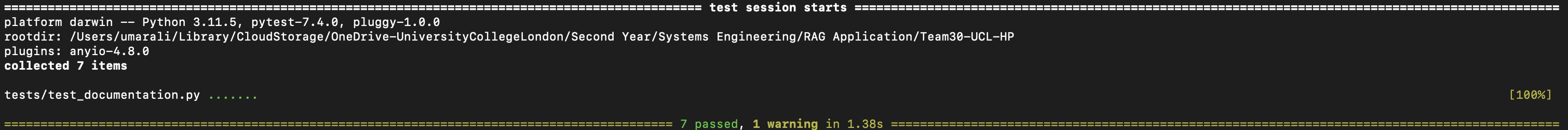 Unit testing was an essential step in ensuring the robustness and correctness of our system. By isolating individual components and verifying their behaviour under controlled conditions, we could detect and resolve issues early in the development process. Given the complexity of our Retrieval Augmented Generation (RAG) pipelines, unit tests helped us validate key functions such as data extraction, and chat history retrieval. By rigorously testing these components, we ensured that our system performed reliably and consistently across various formats and input conditions.