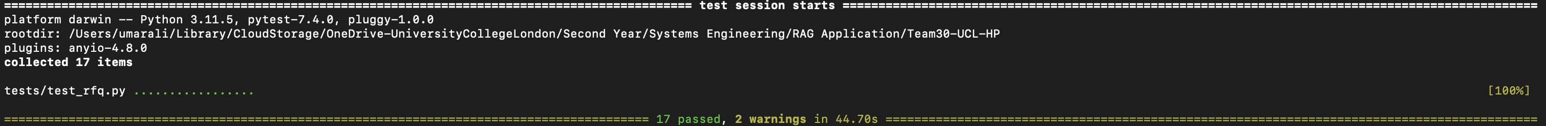 The testing suite for the RFQ use case ensures that the system accurately extracts, processes, and retrieves relevant information from procurement documents. Unit tests cover critical functionalities, such as extracting text from PDFs, identifying and categorising structured tables, and extracting key metadata like customer names, contract durations, and pricing details. The document processing pipeline is validated by testing document loading, splitting, and vector database creation. Additionally, tests ensure that the RAG-based retrieval system correctly retrieves relevant context and generates responses. The chat history functionality is also tested, verifying that past interactions are properly logged and analysed for metrics.