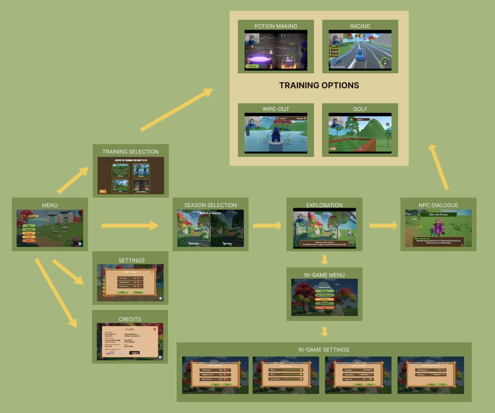 This comprehensive flow diagram illustrates the complete user journey through Super Explorers, from the main menu through season selection, exploration environments, and all mini-games. The diagram demonstrates how users can navigate between different game components and highlights the interconnected nature of the game's interface.