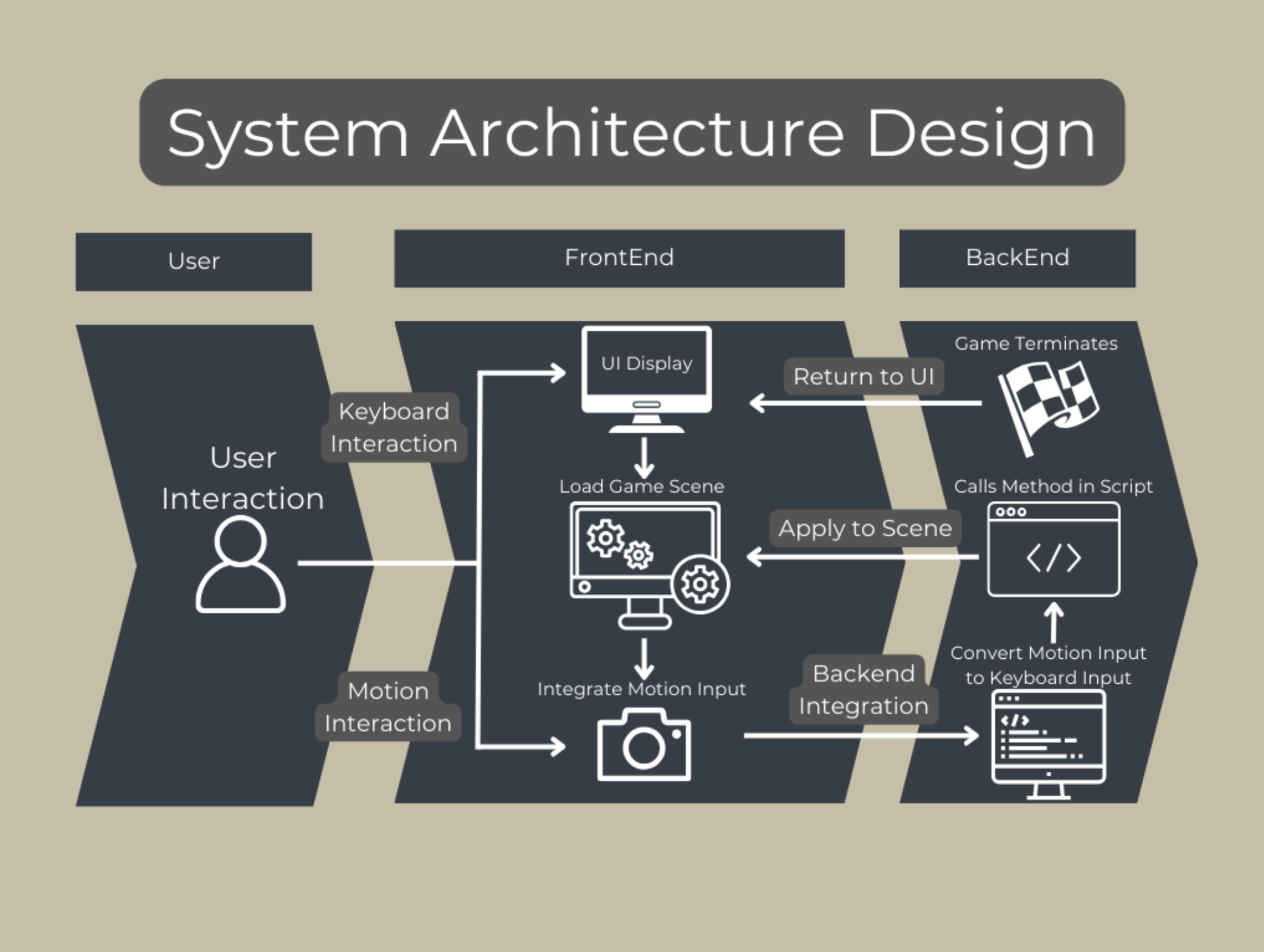 Once the level is ready to be played, a motion input window pops up on the top left of the screen that detects whether a specific body part of the user has entered the designated trigger zone. If the correct input is detected, the frontend sends that information to the backend scripts, converting the motion input into the keyboard input.