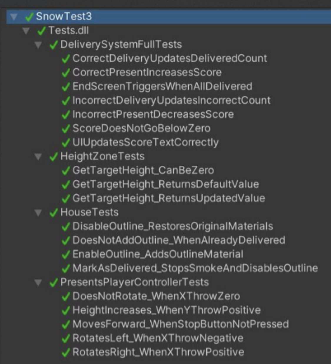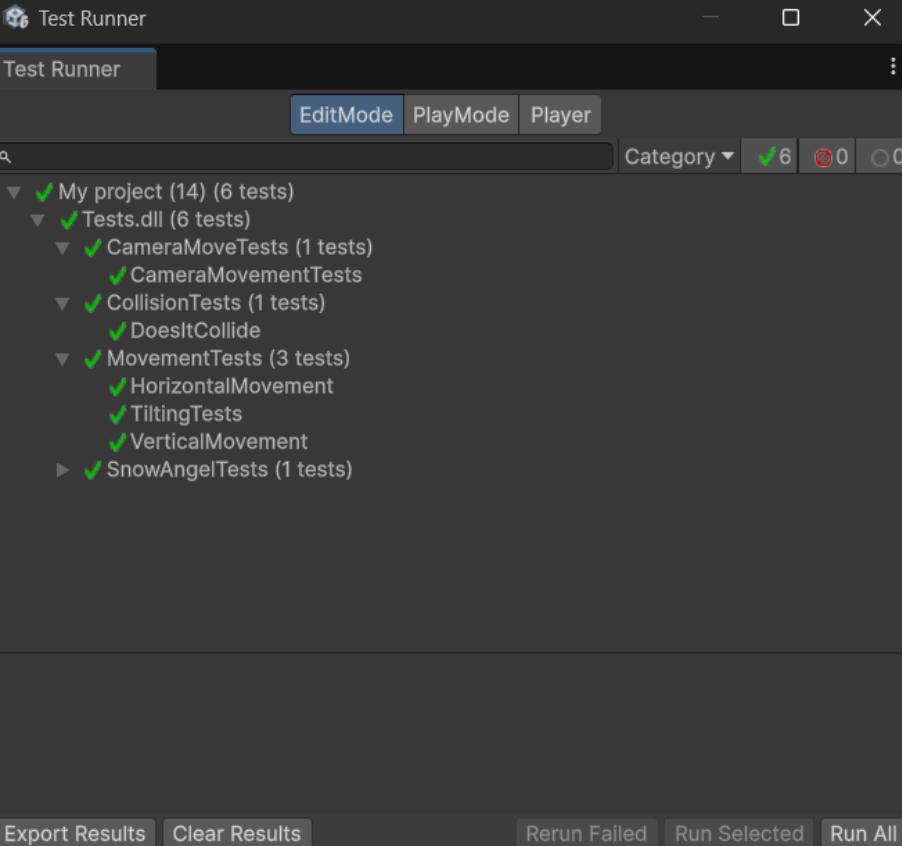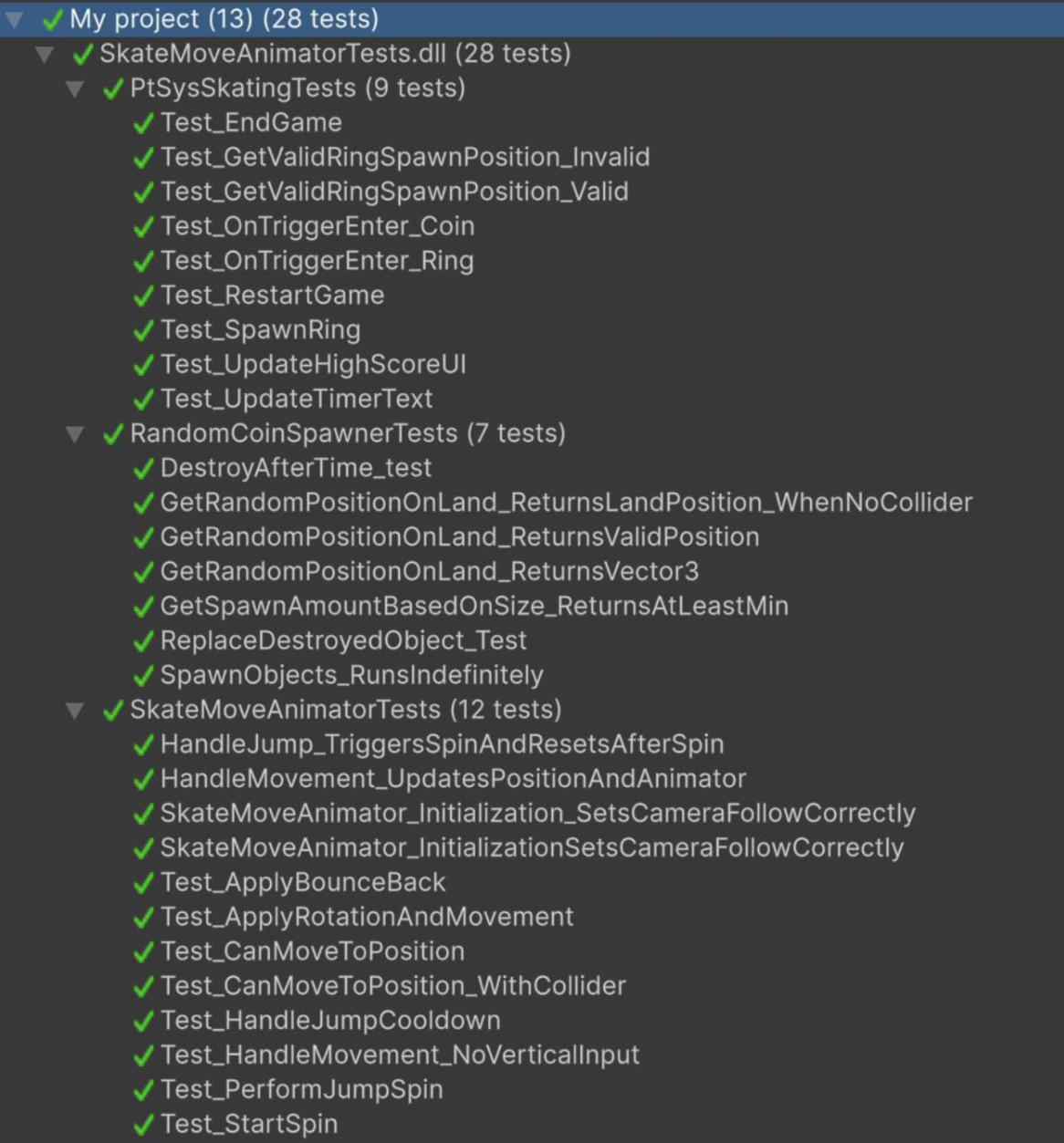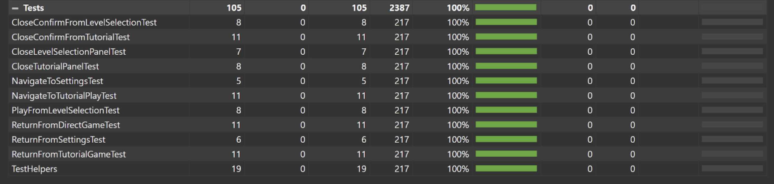 Various methods were written and run using the Unity PlayMode Test Runner to verify whether users had consistent access to all layers of the game and could transition between scenes without any exceptions.