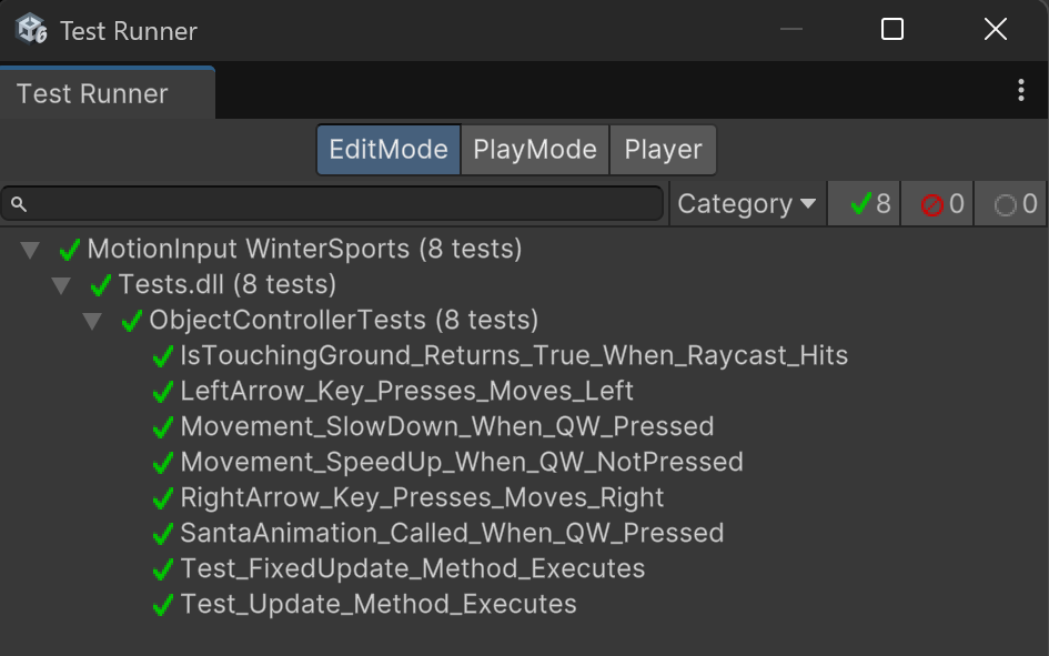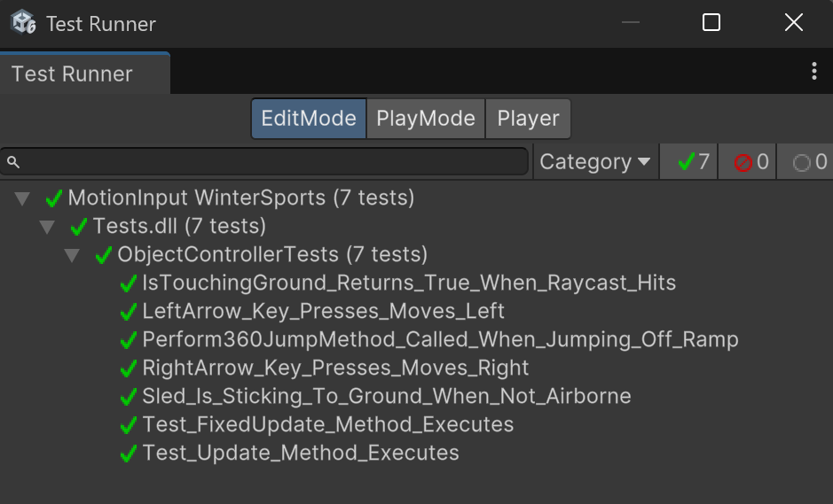 We use Unity’s built-in Test Runner to conduct our tests. This tool is ideal as it seamlessly interacts with Unity components and GameObjects. We use: